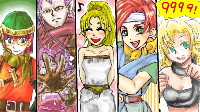 左から順に→ルッカ(風呂桶さん)、魔王(ペンペンさん)、マール(たすく)、クロノ(碧羽さん)、エイラ(あゆんさん)